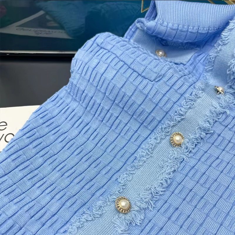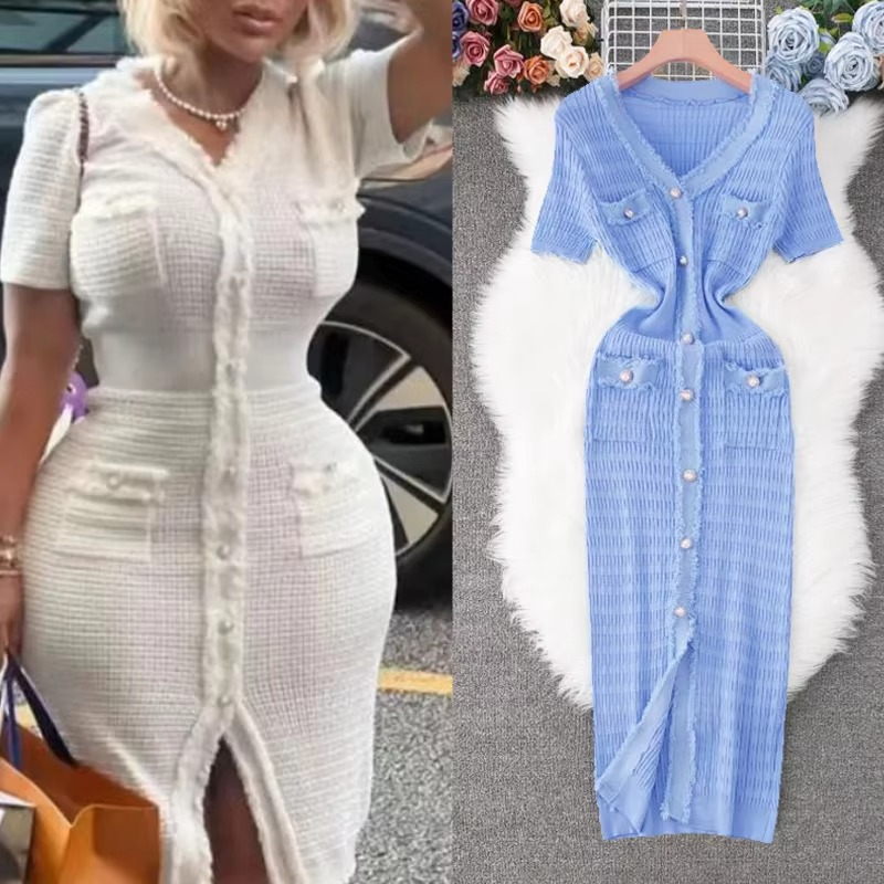 Women Denim Breathable Straight Dark Knitted Long Elegant V-neck Single-breasted Split Sweater Dress Office