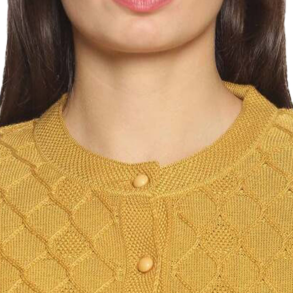 Women Lightweight Wool Blend Cable Knit Cardigan Long Sleeved Yellow Sweater Button Down Design Crew Neck Winter Casual Style