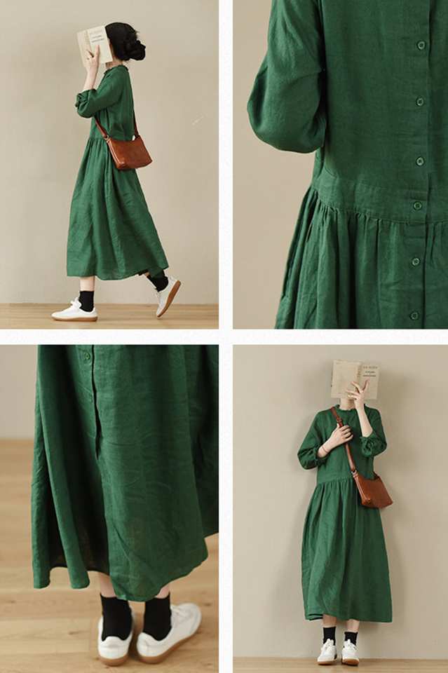 Product Name:Linen Emerald Green Shirt Dress