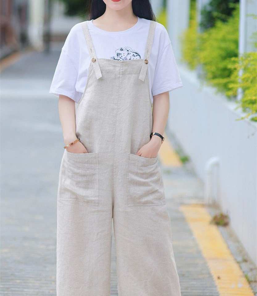 Women's Casual Linen Jumpsuits Vintage Wide Leg & Button Pockets Loose Fit Overalls with Woven Weaving Eco-Friendly