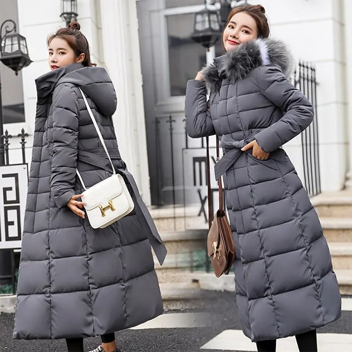 Women Long Puffer Coat with Fur Hood Belted Waterproof Snake Skin Thick Winter Outerwear Full Length Casual Streetwear
