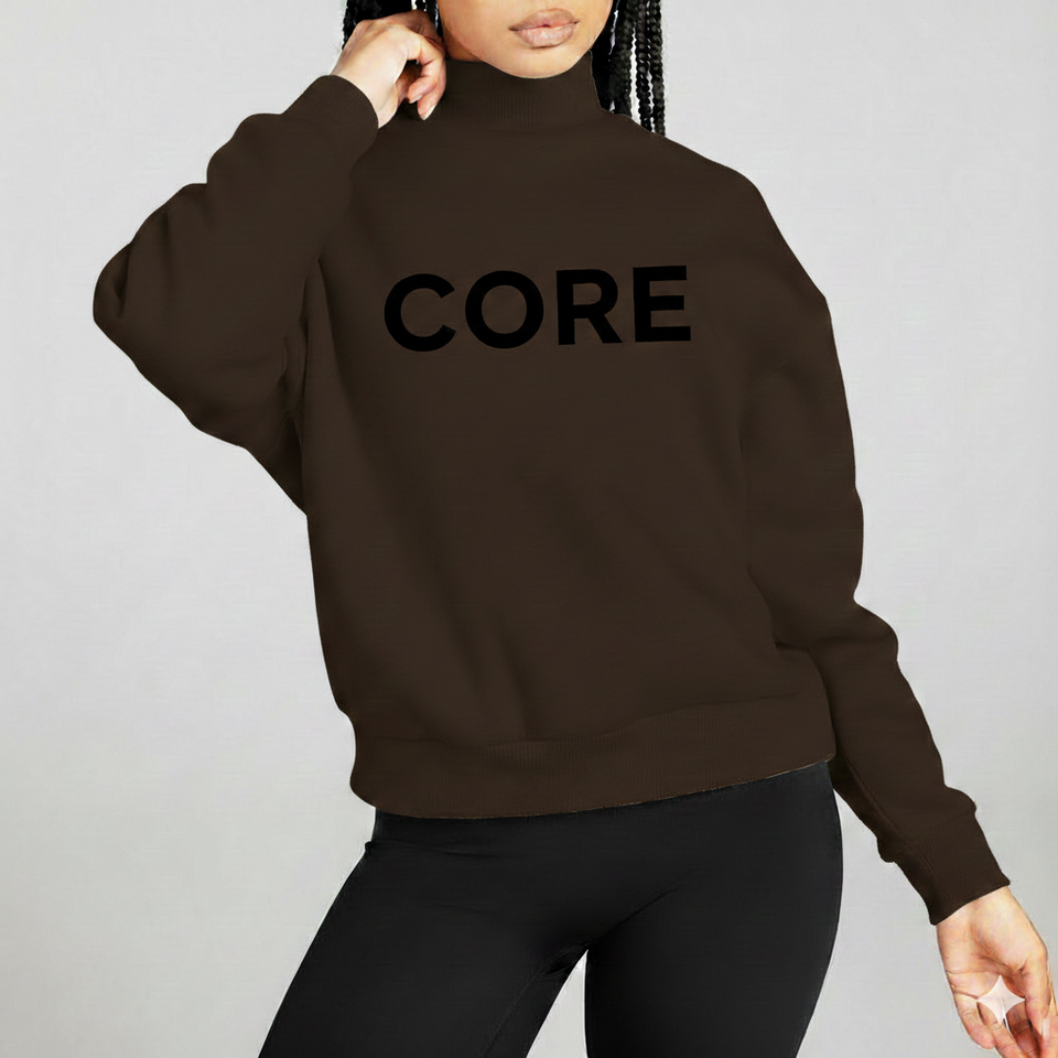 Women Long Sleeve Knitted Oversized Mockneck Winter Pullover Top Loose Fit Cozy Feel Street Fashion Everyday Wear Front Logo
