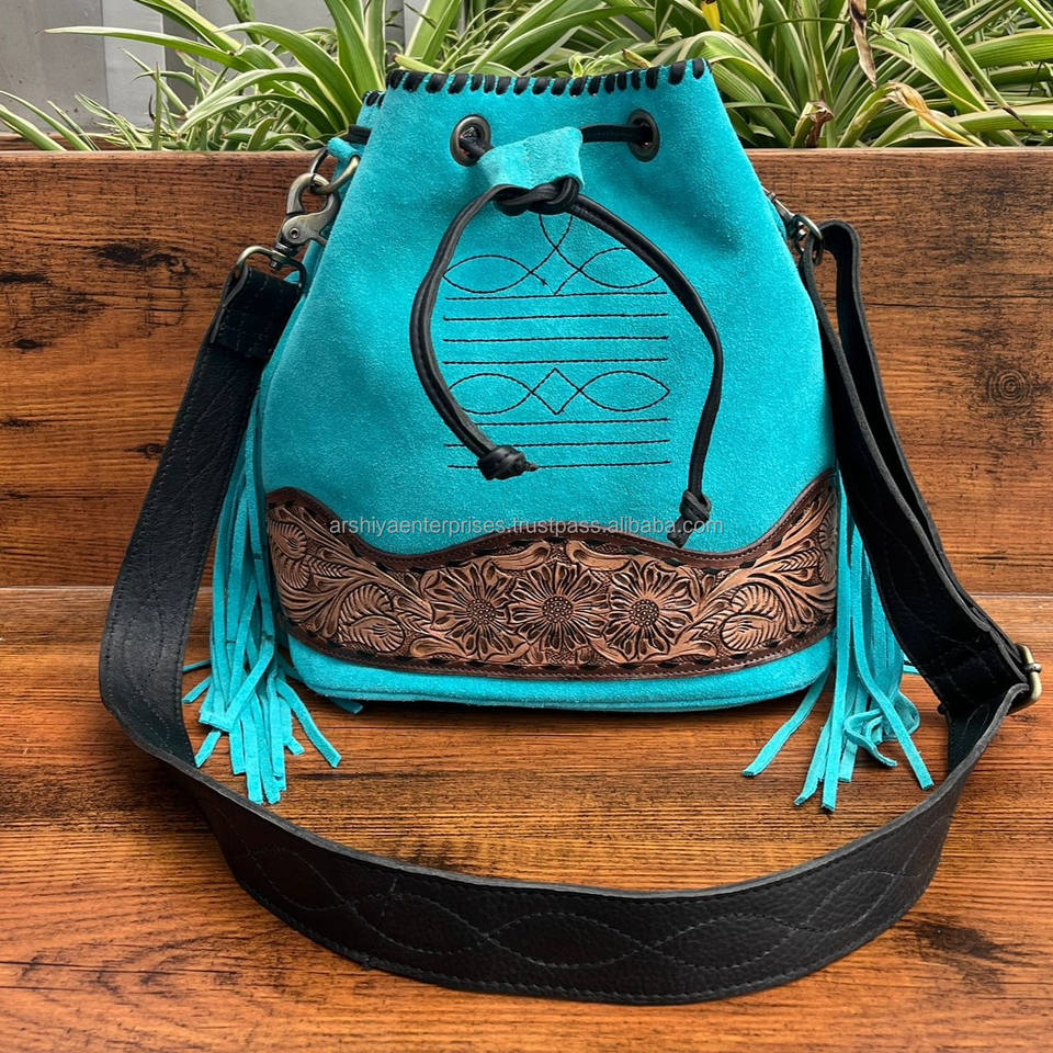 Women Luxury Boot Stitch Hand Tooled Suede Leather Fringe Crossbody Shoulder Bucket Bags Custom Designer Cowhide Leather Handbag