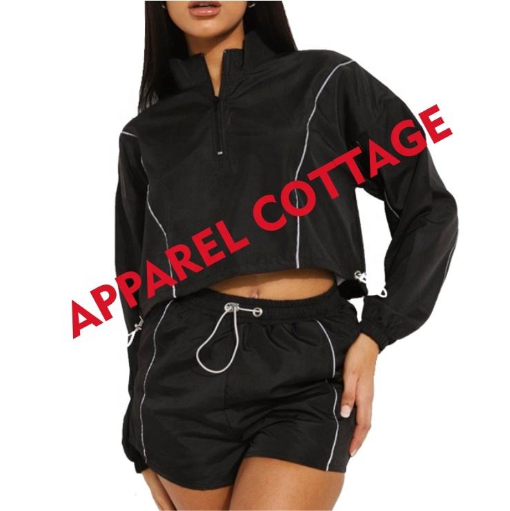 Women Nylon Reflective Piping Shell Black Long Sleeve Crop Windbreaker Tracksuit Short Set Pullover Hoodies Sweatshirts Custom