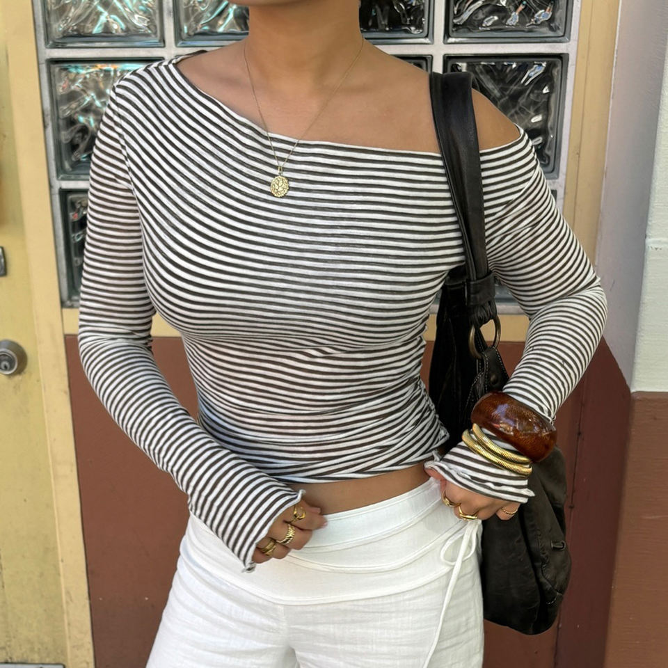 Women Off Shoulder Striped Knit Top Slim Fit Cropped Lettuce Trim Long Sleeve Sexy Girl T Shirt