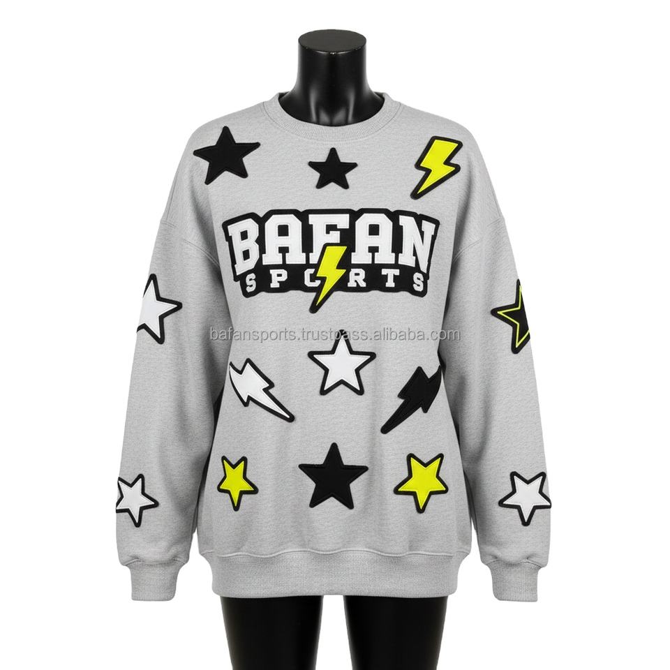 Women Oversize Sweatshirt 320GSM Fleece Grey with Black White Yellow Embroidery CustomLogo Patchwork Women breathable Sweatshirt