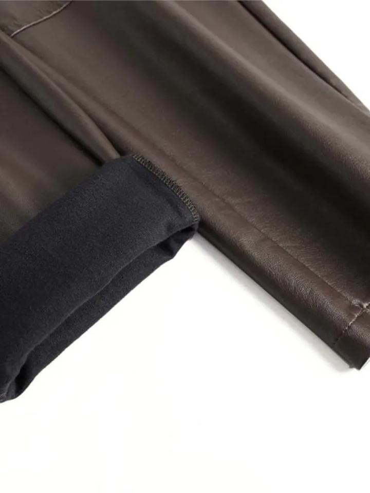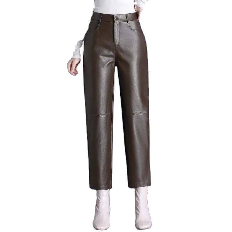 High Quality Women's PU Leather Ankle-Length Pencil Pants Autumn Winter Warm Elastic Waist Canvas Trousers Elegant Design