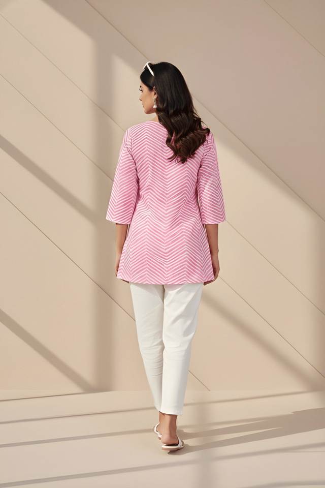 Women Pink Chevron Print Cotton Blend Tunic Top Round Neck Three Quarter Sleeve Regular Length Fully Stitched Casual Ethnic Wear