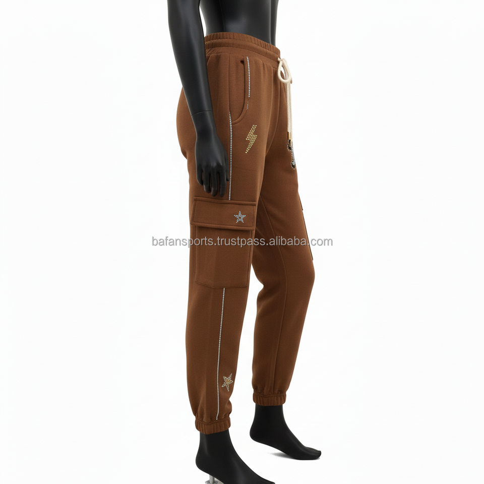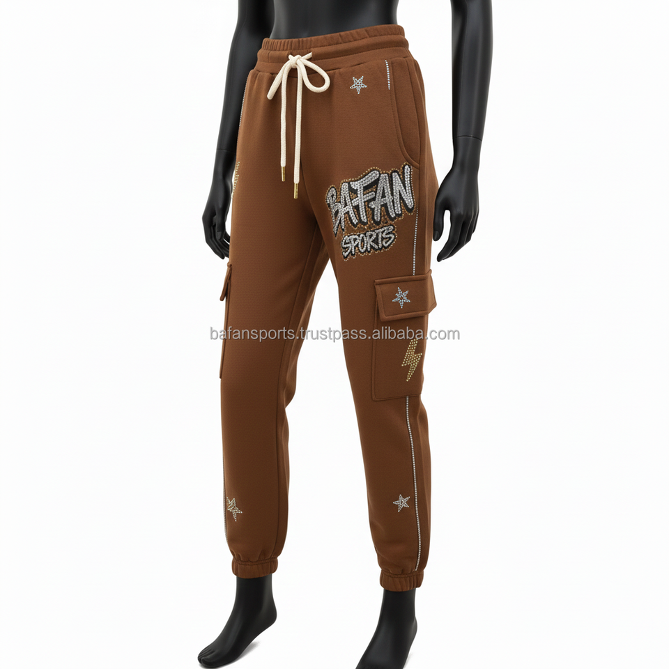 Women Premium Fleece Jogger Pants 330 GSM Soft Warm Fabric Brown Cargo Pockets Rhinestone Custom Logo Street Style women's pants