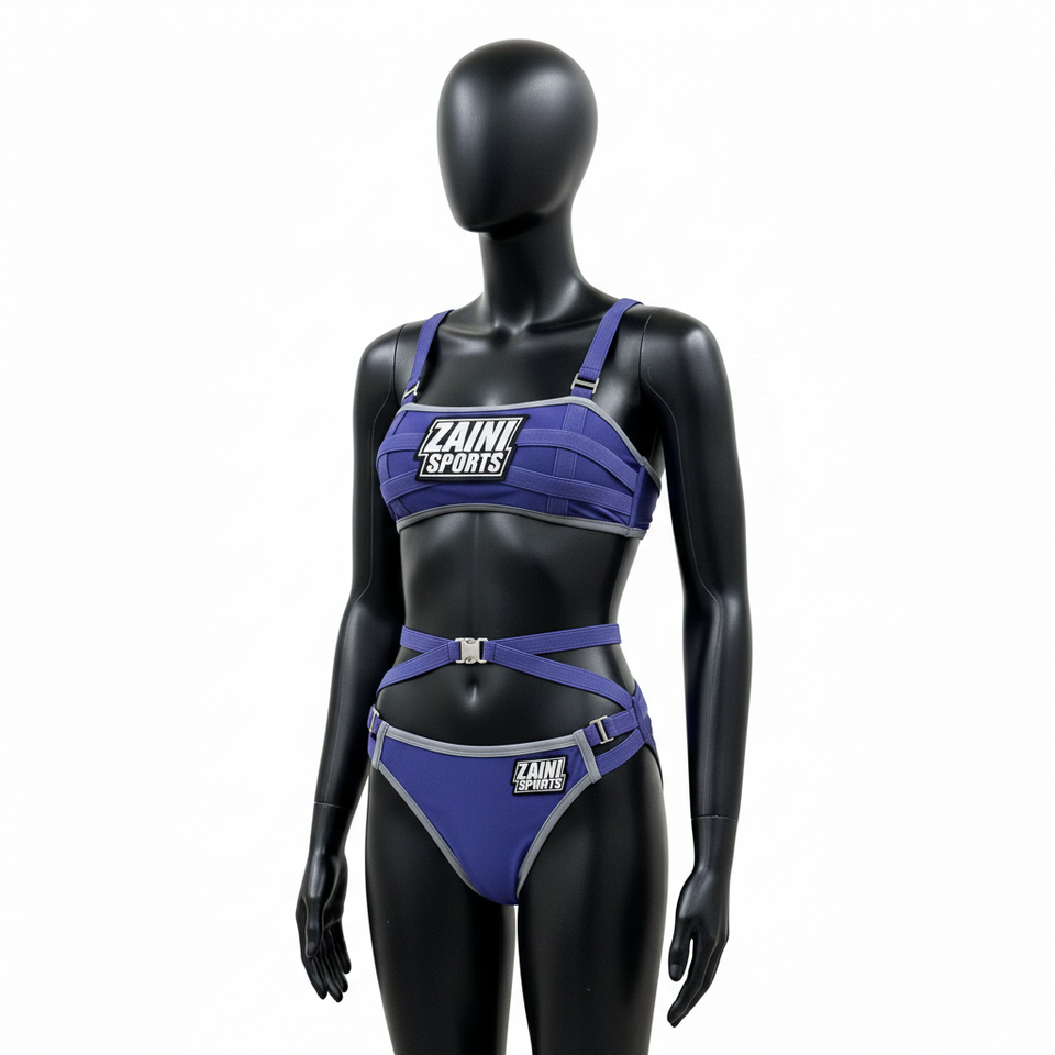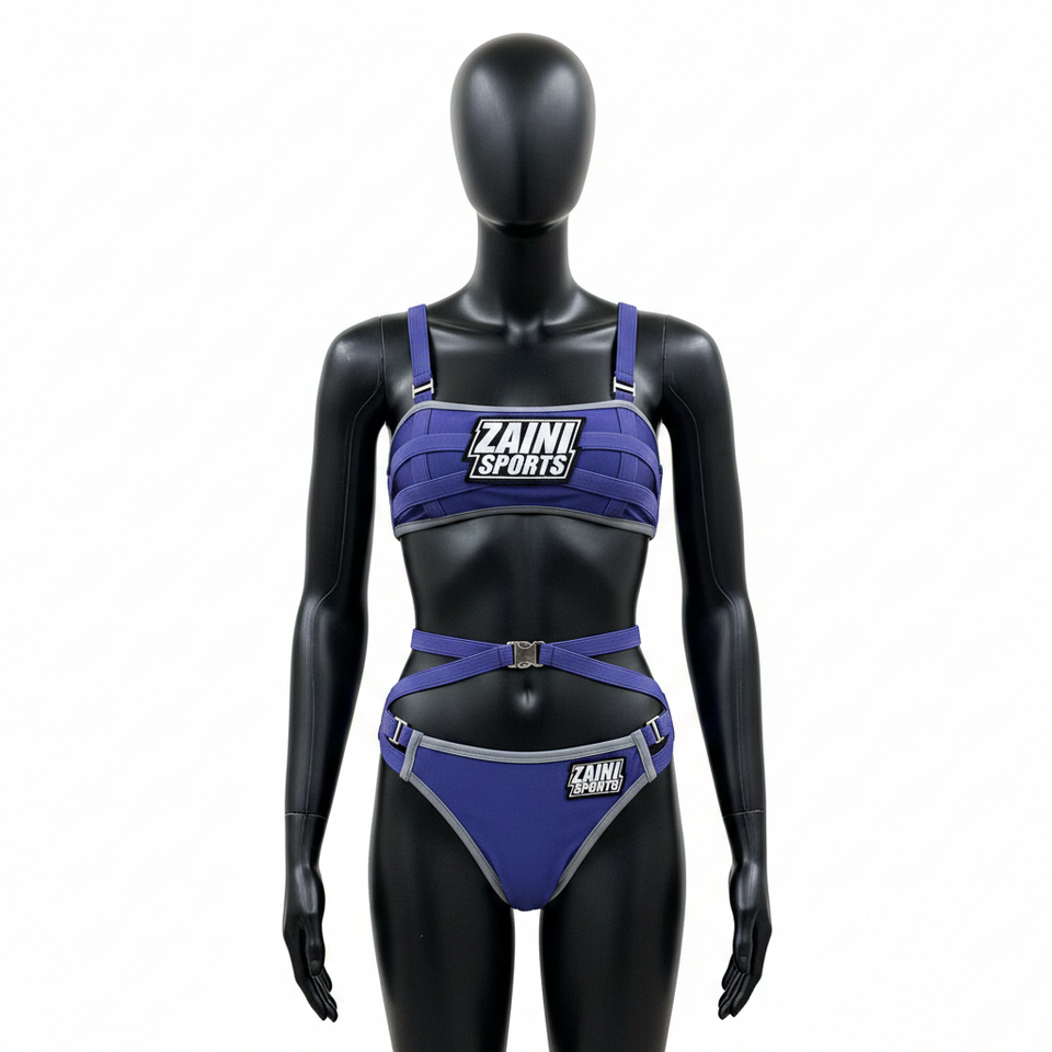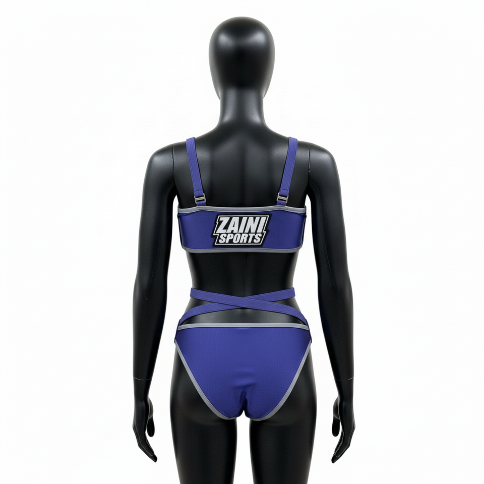 Women Premium GSM Nylon Spandex Bikini Set Blue Grey Elastic Strap Panel Sport Fit Custom Patch Logo women for Bikini Set