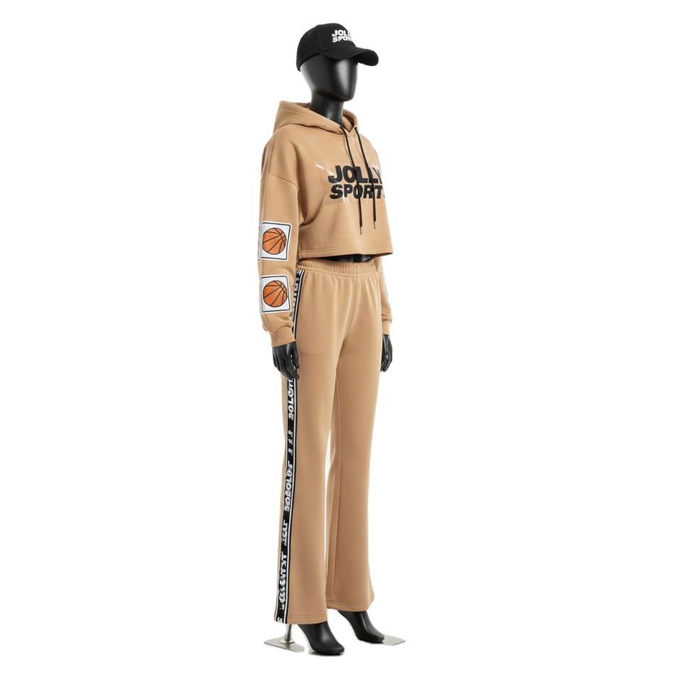 Women Premium GSM Soft Poly Fleece Tracksuit in Beige with Sleeve Patch Panels and Custom Logo HeatTransfer Tracksuits Plus size