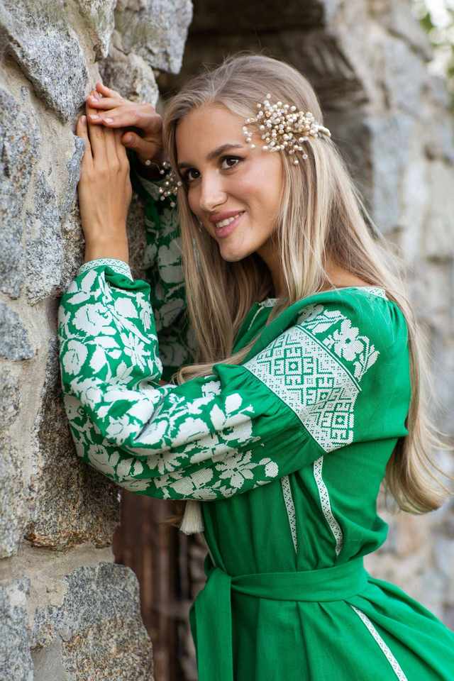 Women Premium Quality Long Midi Maxi Dress Ukrainian Embroidered Green Linen Sweet Style Lace Decoration Bulk