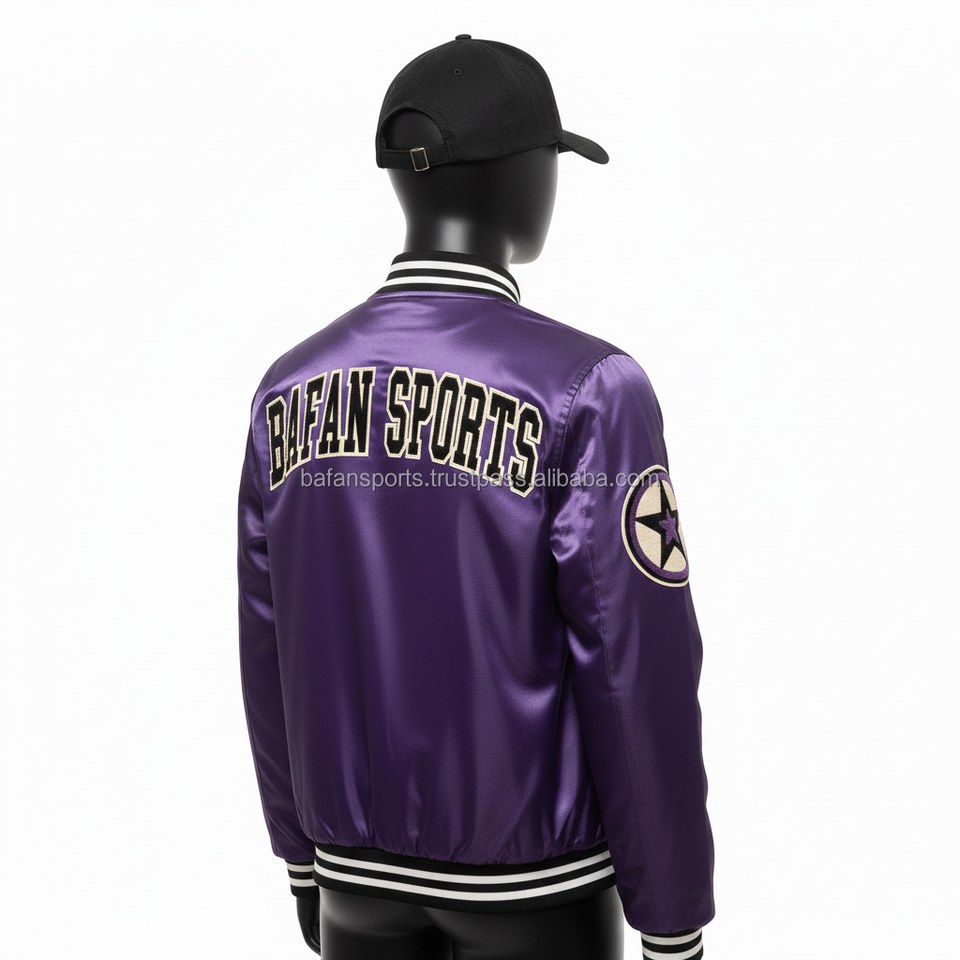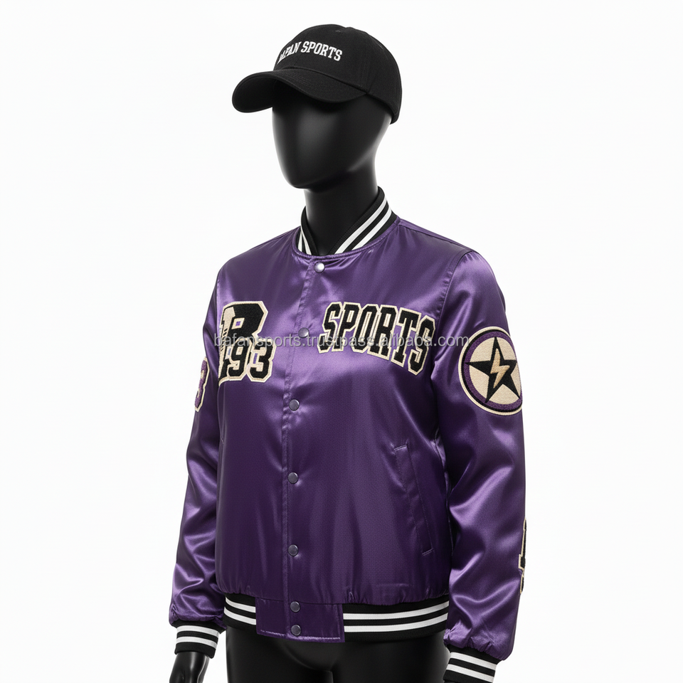 Women Premium Satin Jacket Smooth Shiny Purple Fabric Custom Chenille Embroidery Logo Varsity Style Women Satin Jackets