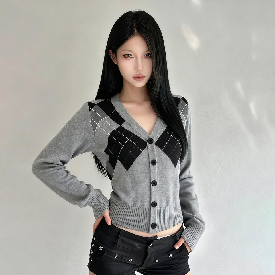 Women Preppy Style Argyle Color Block Knit Cardigan V Neck Button Front Slim Fit Long Sleeve Sweater