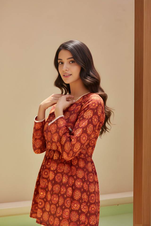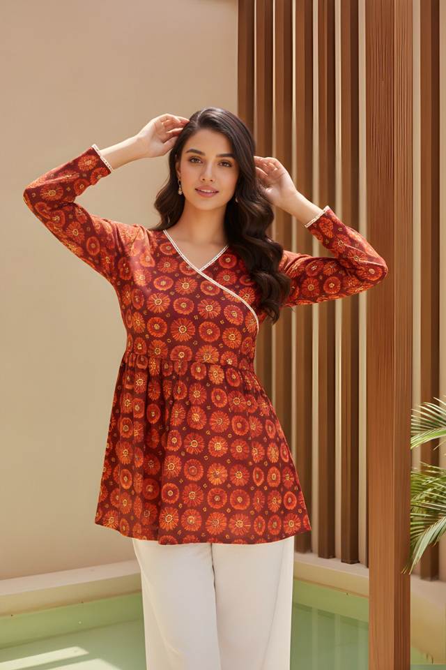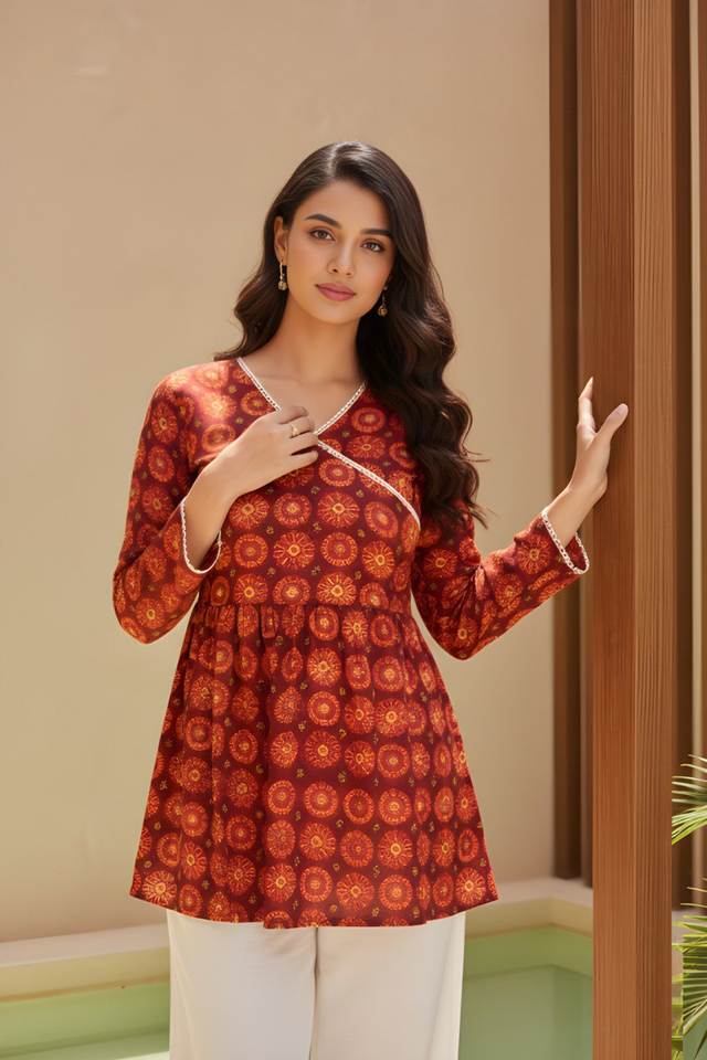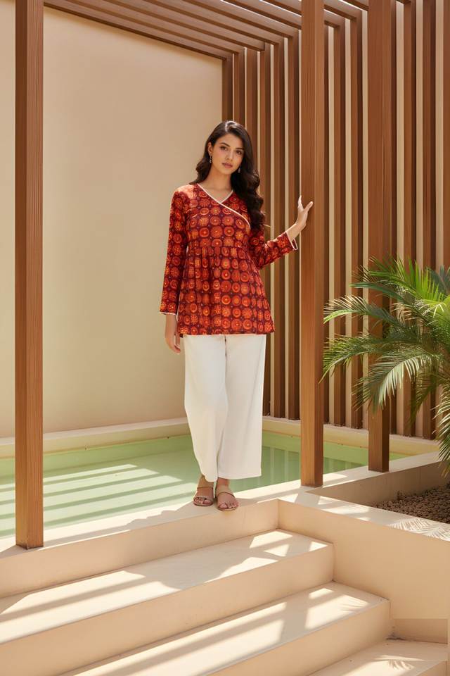 Women Printed Delta Silk Angrakha Style Tunic Digital Printed V Neck Full Sleeve Three Meter Flair Regular Length Fully Stitched