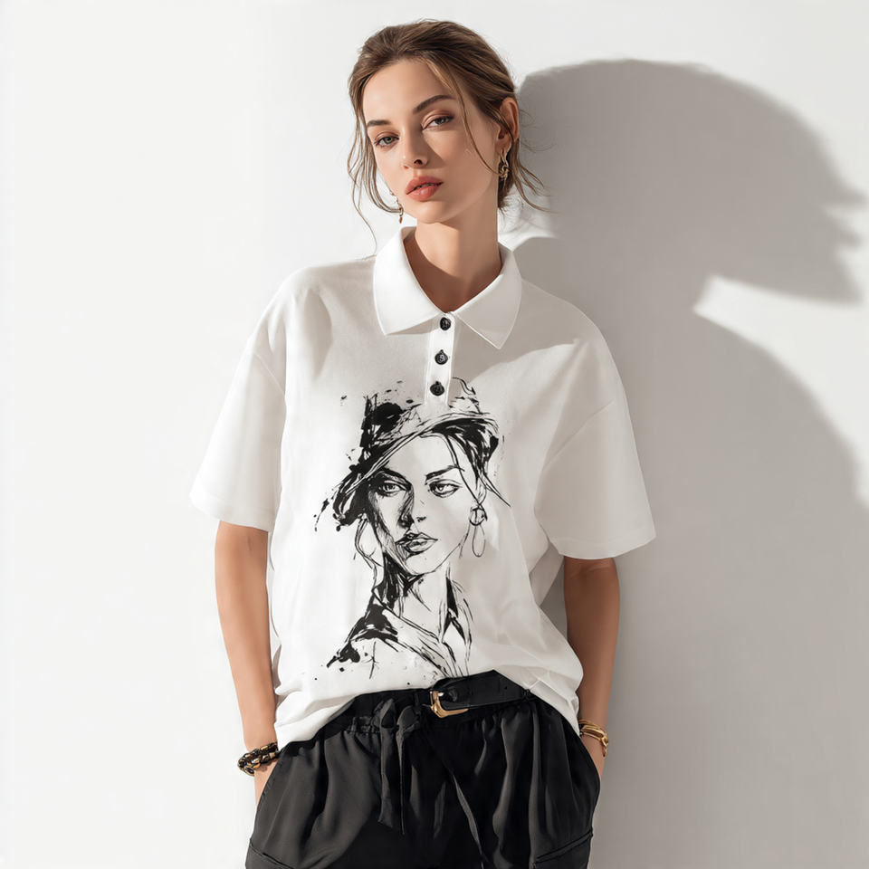 Keywords:Drop Shoulder Print Polo Shirt Ladies