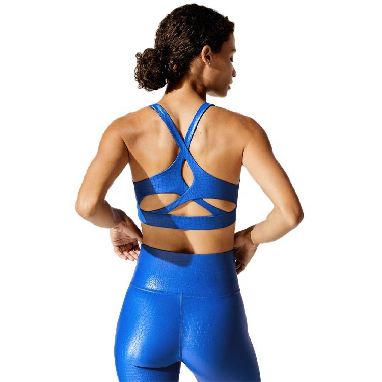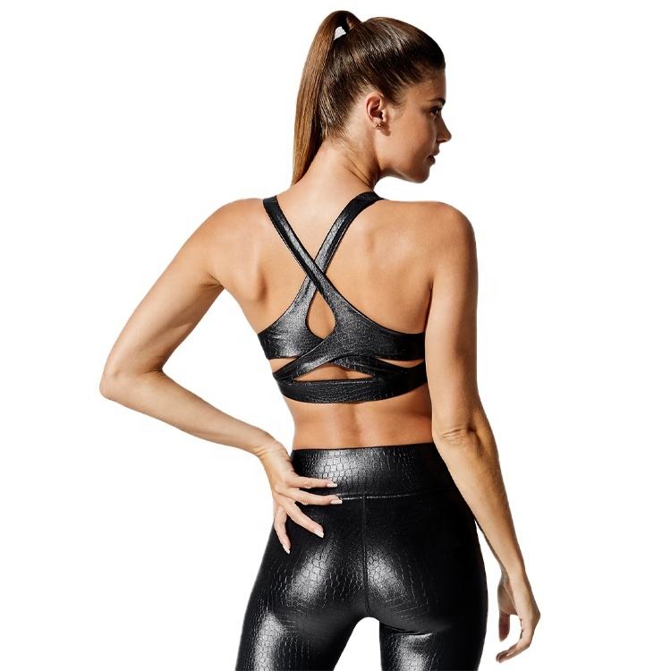 Women Push up Black Glossy Emboss Crocodile Pattern Fitness Yoga Bra and Pants Set Sexy Girl High Support Workout Sports Bra