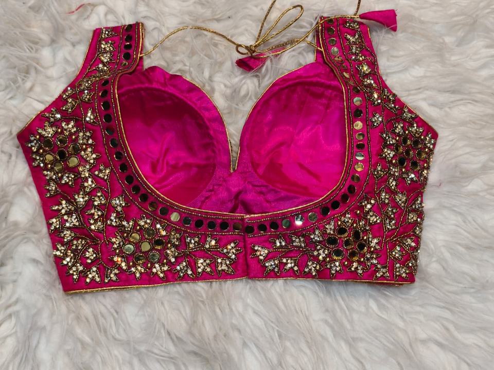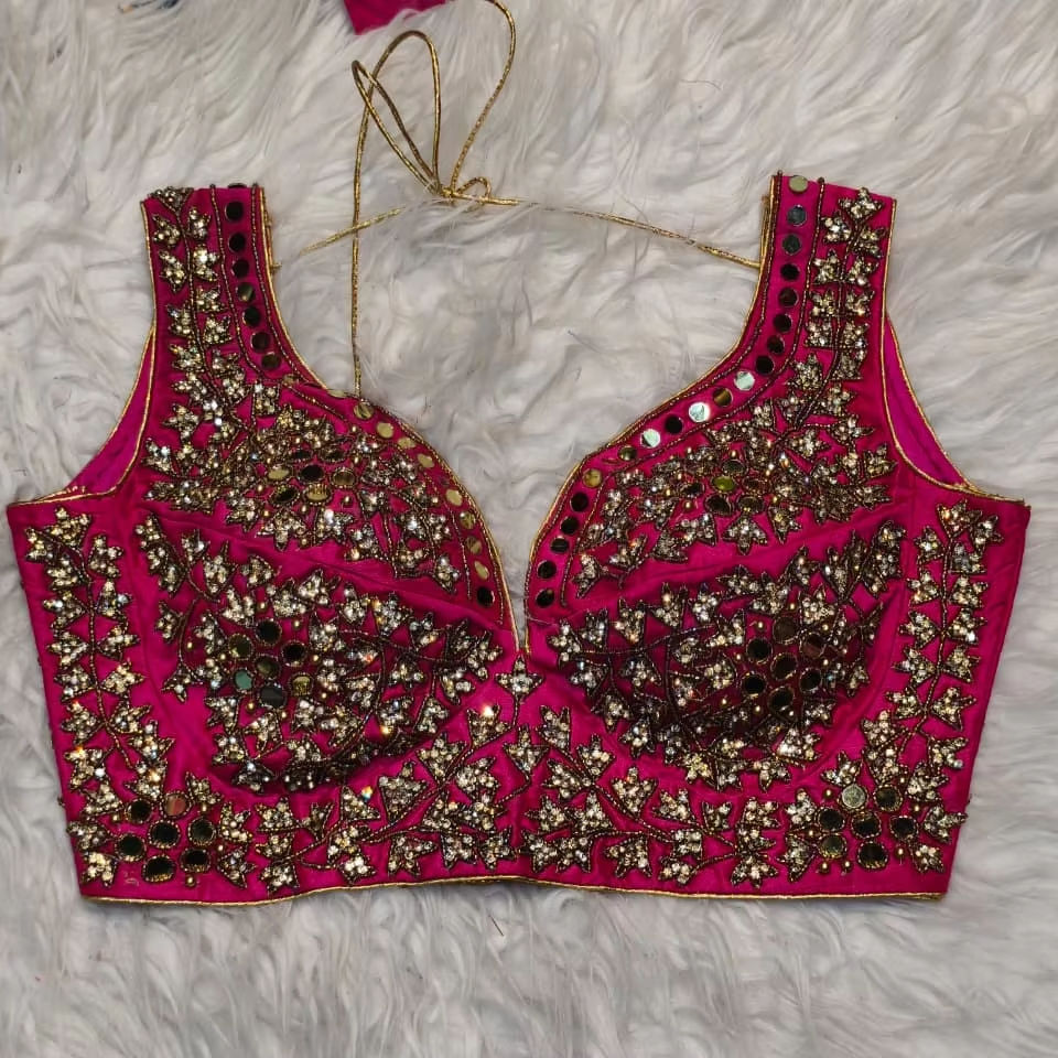 Women Rani Pink Bridal Designer Blouse with Real Mirror Zircon Heavy Handwork Embroidery
