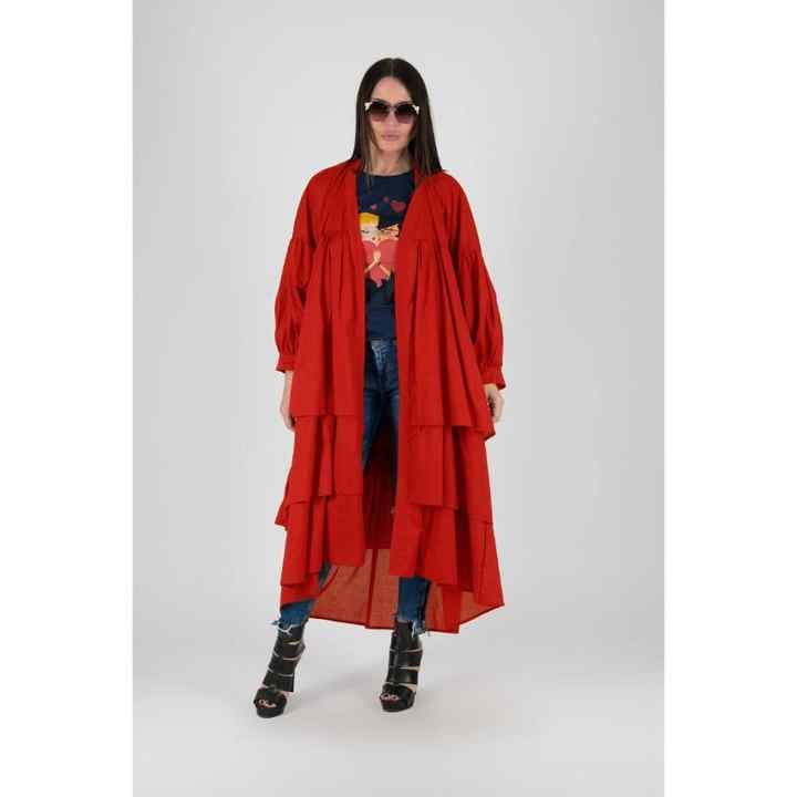 Women Red Eco-Friendly Washable Floor-Length Open Front Cardigan Dress Layered Oversized Casual Kaftan Coat Natural Waist