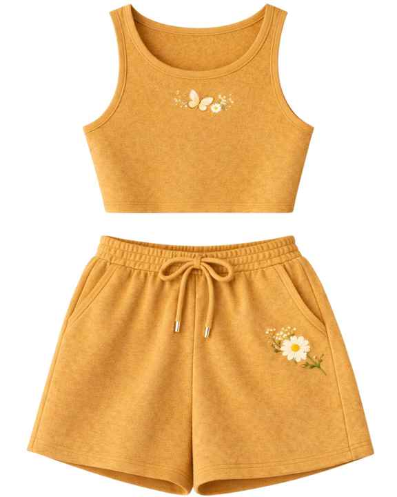 Women Ribbed Crop Tank Top And Drawstring Shorts Set Mustard Yellow With Butterfly Daisy Embroidery Casual Lounge Two Piece