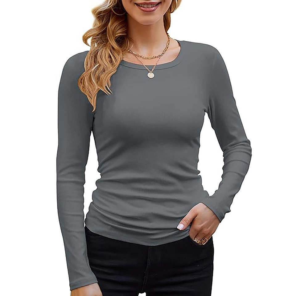 Women Ribbed Long Sleeve Top Slim Fit Crew Neck Knit Stretch Basic Casual Layering T-Shirt Breathable Long Sleeve T-shirts