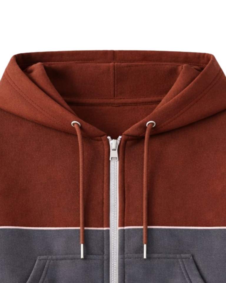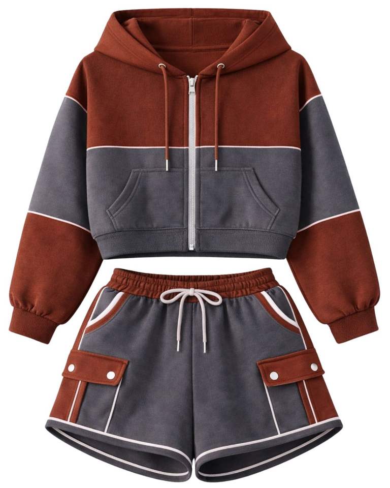 Women Rust Brown And Charcoal Grey Color Block Crop Zip Hoodie Shorts Set With Cargo Pockets Casual Two Piece Outfit Wholesale