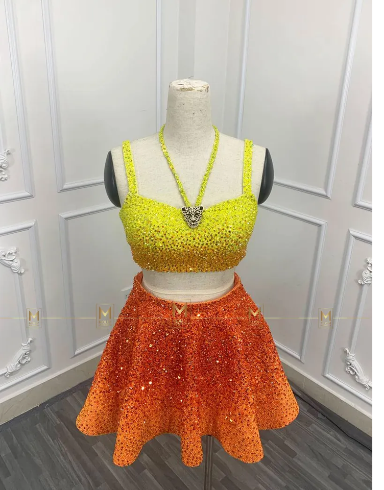 Women Satin Beaded Skirt Top Set Shiny Sparky Sequin Embroidered Fringes Sweet Style Natural Waistline Breathable Nonwoven