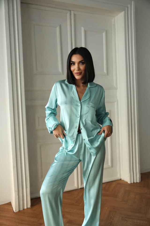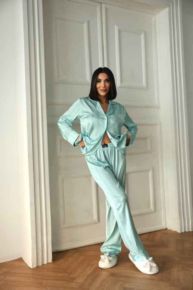 Women's Solid Thermal Breathable Spring Satin Pajama Set Long Sleeve Button-Up Shirt and Pants