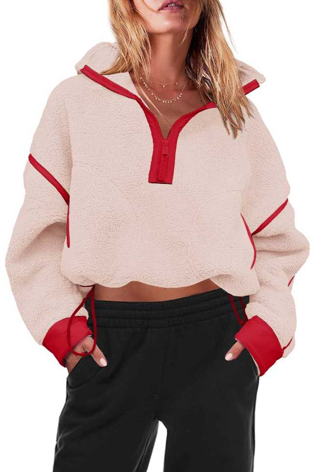 Women Sherpa Fleece Quarter Zip Hooded Sweatshirt Soft Warm Pullover Long Sleeve Contrast Trim Cozy Casual Top Comfy Autumn Wear