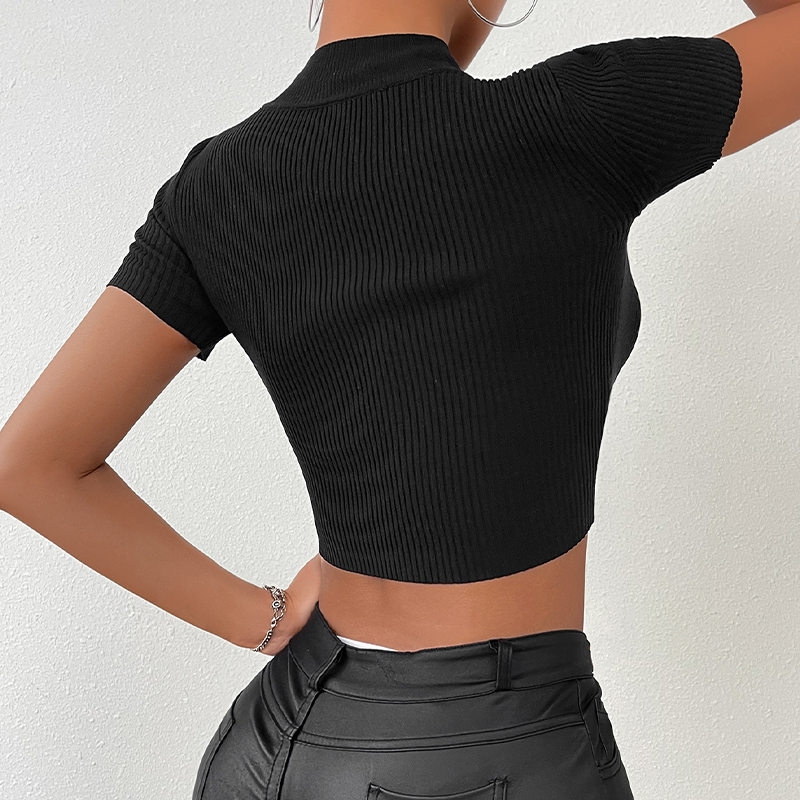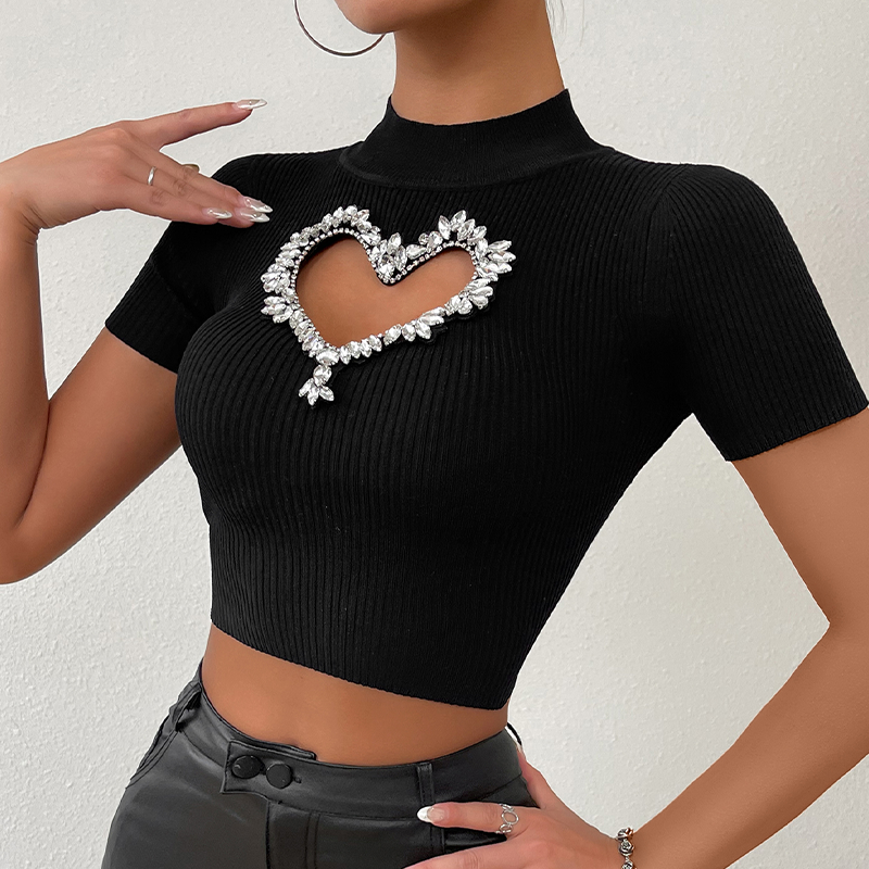 Women Short Sleeve Ribbed Knit Crop Top with Heart Cutout and Rhinestone Decoration Slim Fit Casual Fashion T Shirt