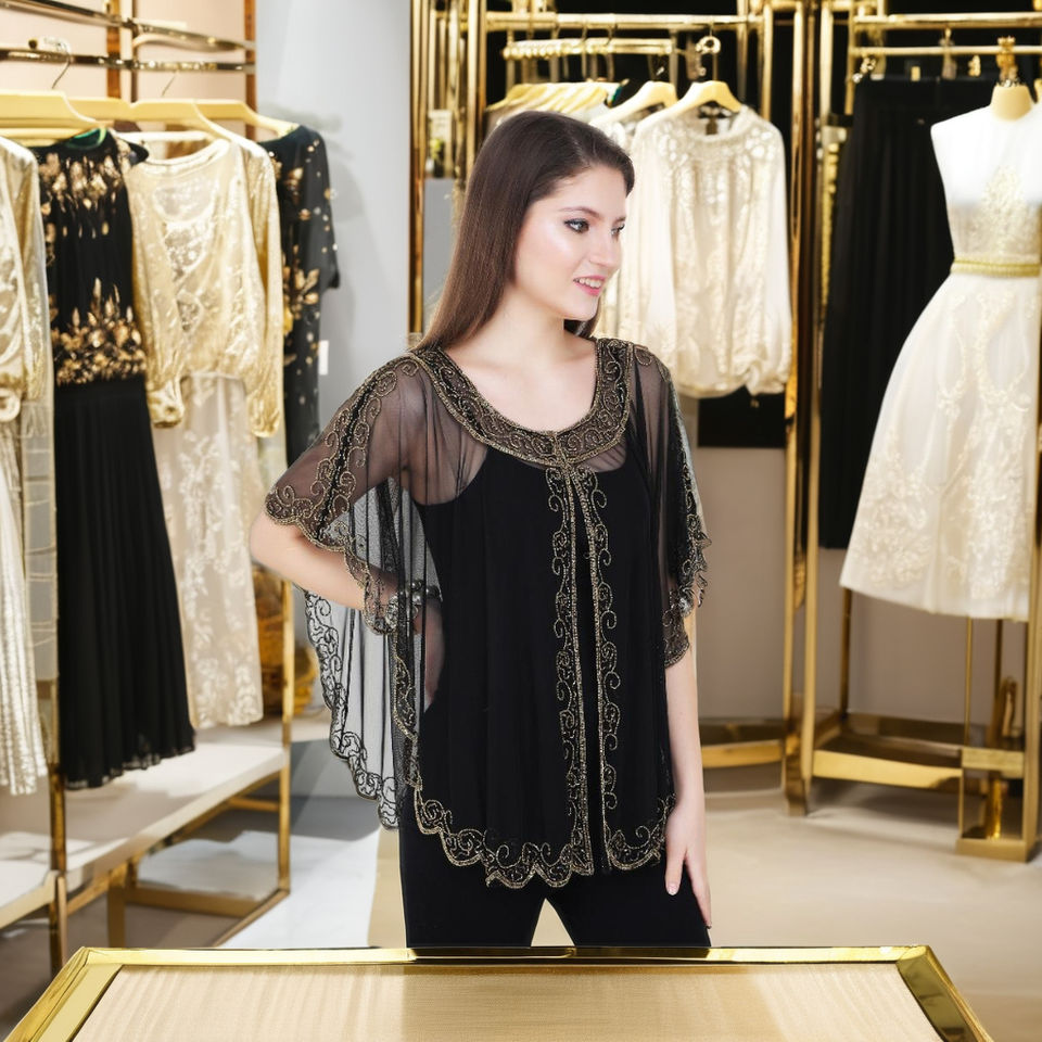 Women Short Sleeve Western Long Poncho Tops Shrug Dress Hand Beads Sequins Embroidery Work Long Poncho for Women Party Club Wear