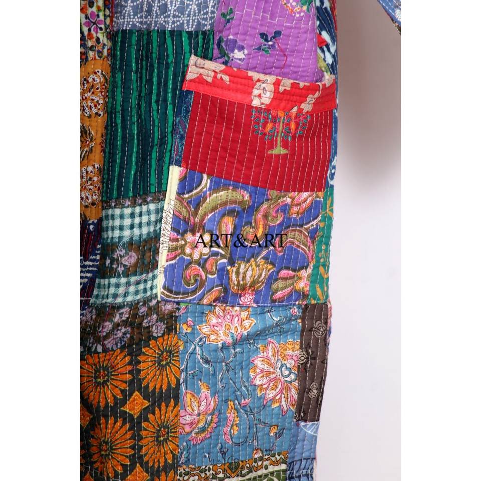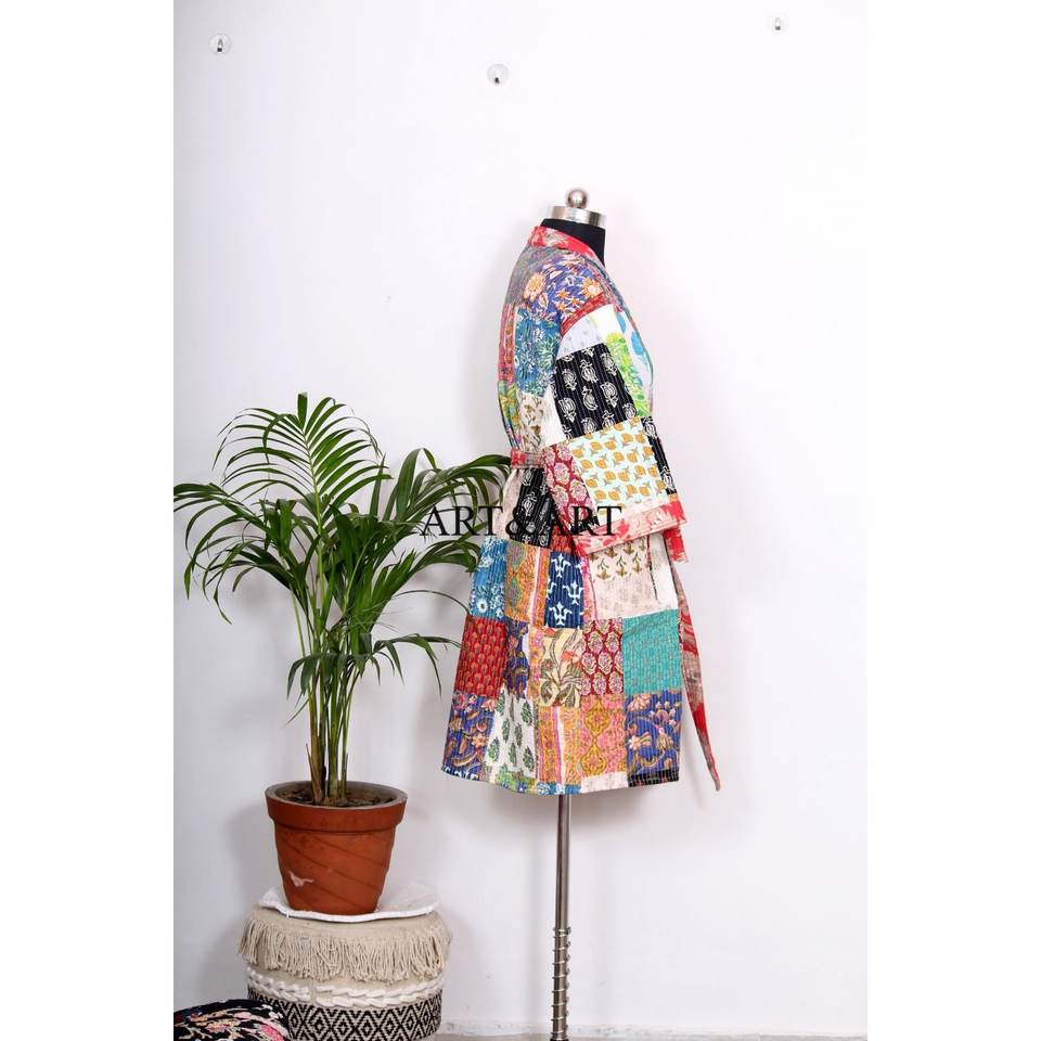 Women Silk/Cotton Vintage Kantha Bohemian Kimono Jacket Summer Spring Breathable Adjustable Drawstring Closure Free Size