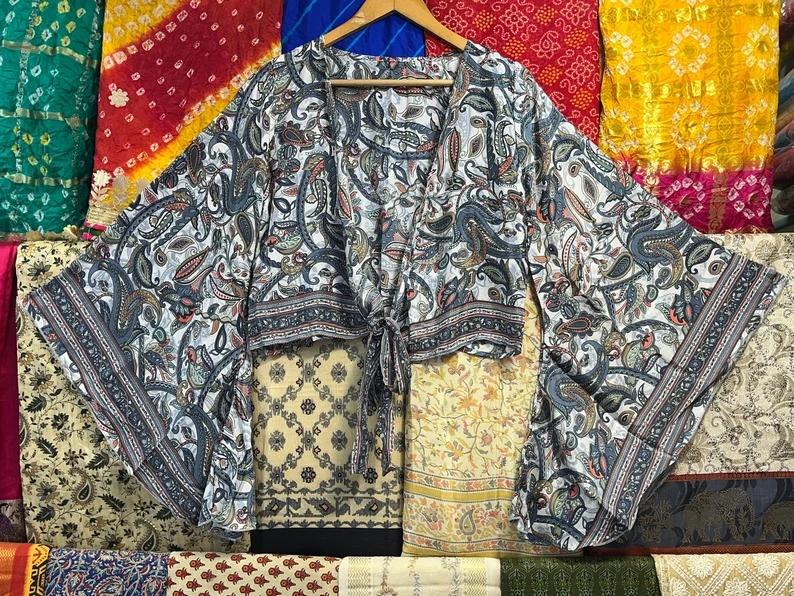 Women Silk Tie Top, Indian Floral Printed Blouse Wrap Crop Top, Front Tie Crop Top, Bell Sleeves Silk Crop Top, Bohemian Comfy