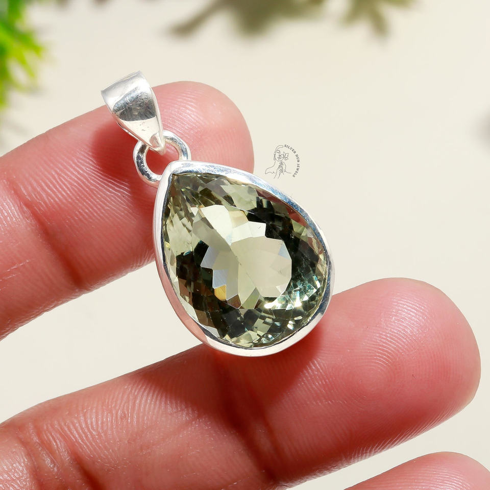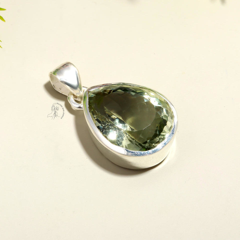 Women Silver Pear Shape Green Amethyst 925 Sterling Silver Gemstone Bezel Set Handmade Jewelry Gift for Girl Stone Pendant