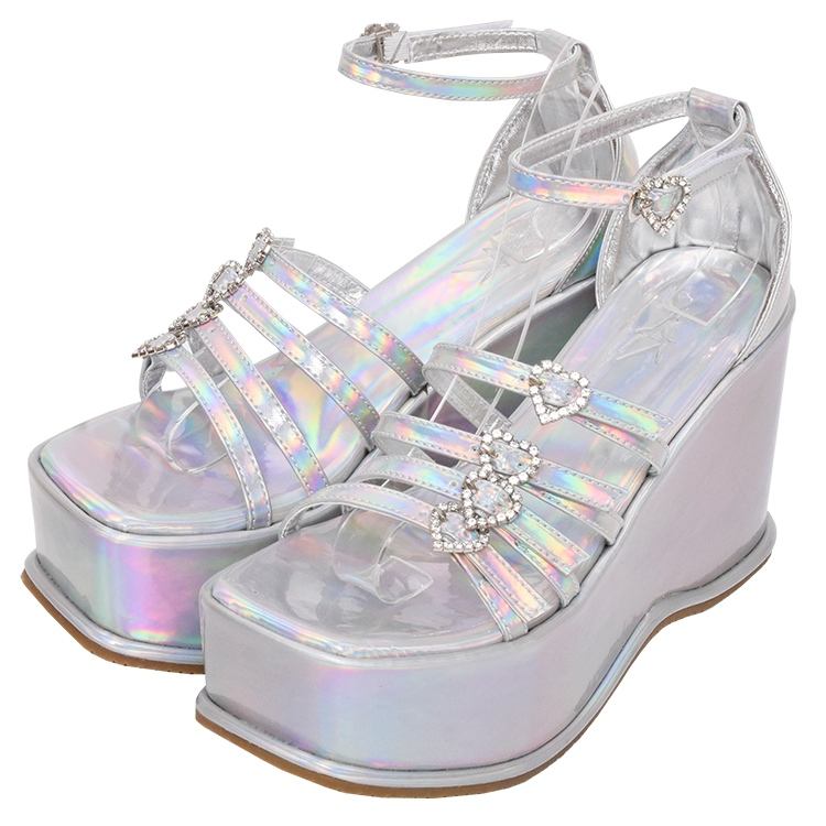 Women Synthetic Silver Wedge Sandals 10cm Quad-Strap Padded Anti-Friction Heel Cushion Durable Arch Support Party Style