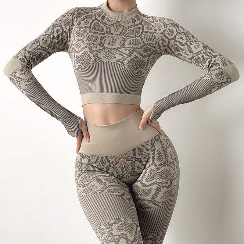 Women Snake Print Gym Seamless Long Sleeve Yoga Set 2022 Sports Apparel Snakeskin Pattern Pri Outfit Wear Crop Top Sweat Suit