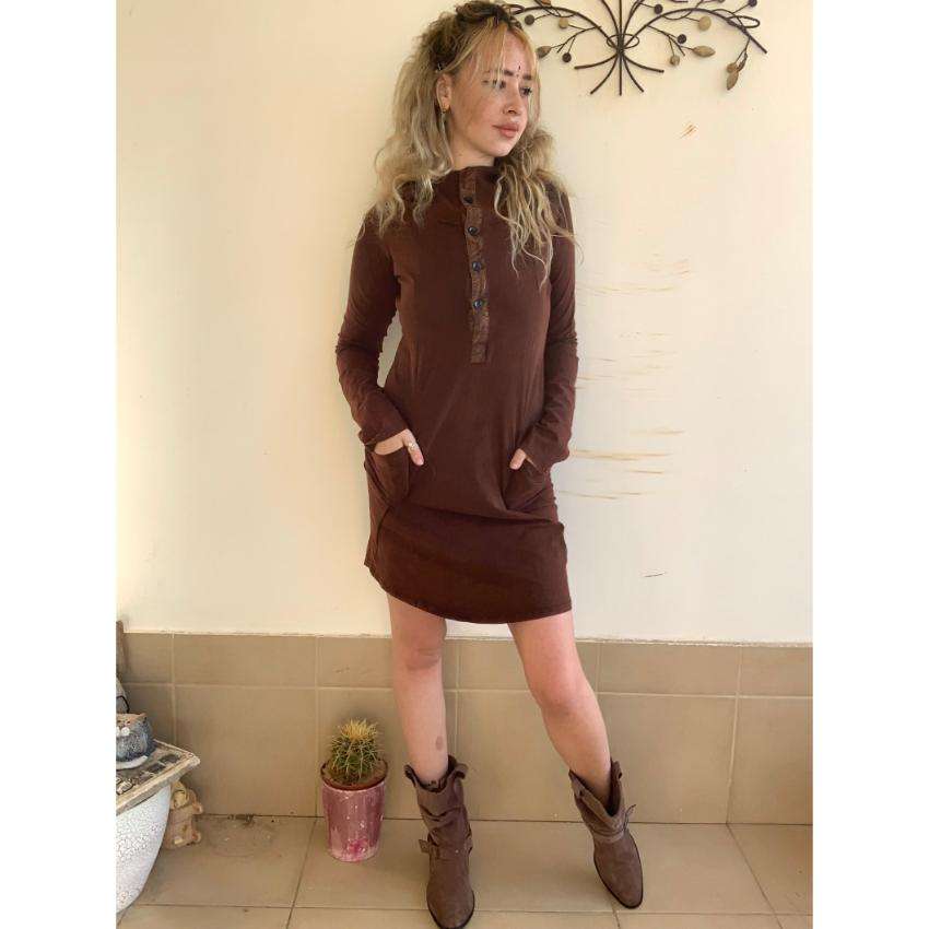 Women Solid Brown Maxi Shirt Dress Long Sleeve Button Placket Pockets Casual Boho Tunic Dress Plain Dyed Natural Waist 100%
