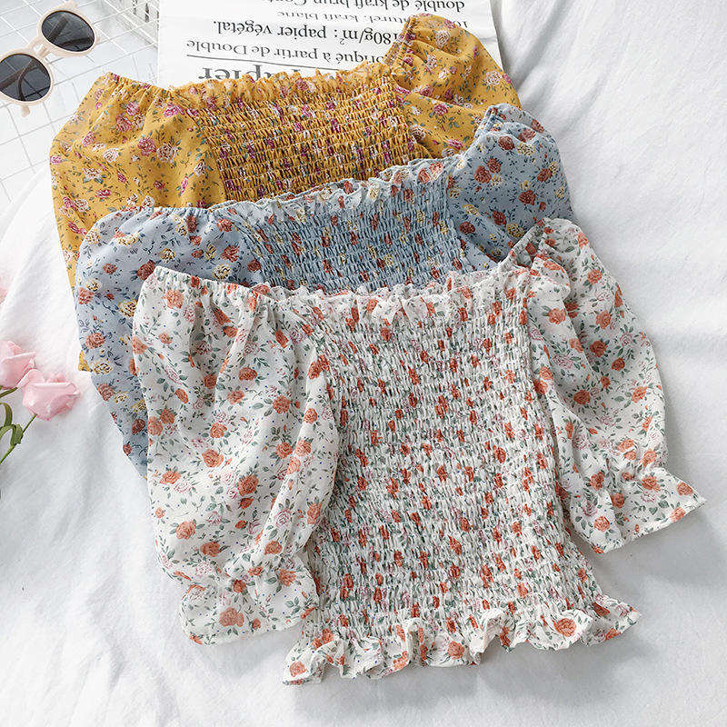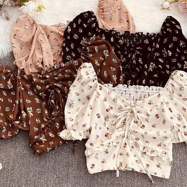 Women Solid Casual Summer Shirt Lace up Ruffle Sexy O-Neck Top Blusas Pleated Stretch Slim Waist Short Crop Blouse