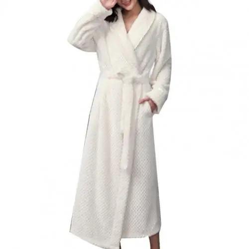 Women Solid Color Hooded Bathrobe Ladies Woven Fleece Plush Warm Breathable Long Robes Nightgown Sleepwear