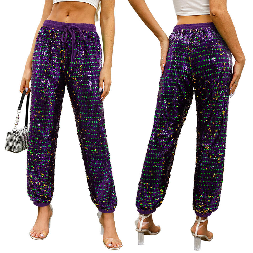 Women Sparkly Sequins Wide Leg Pants Glitter Shiny Trousers for Party Club Wear for Mardi Gras Women