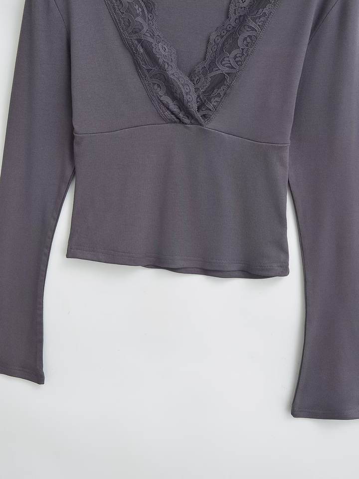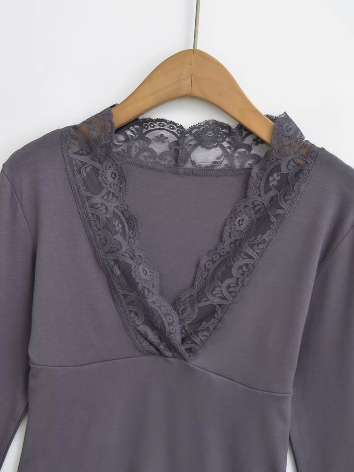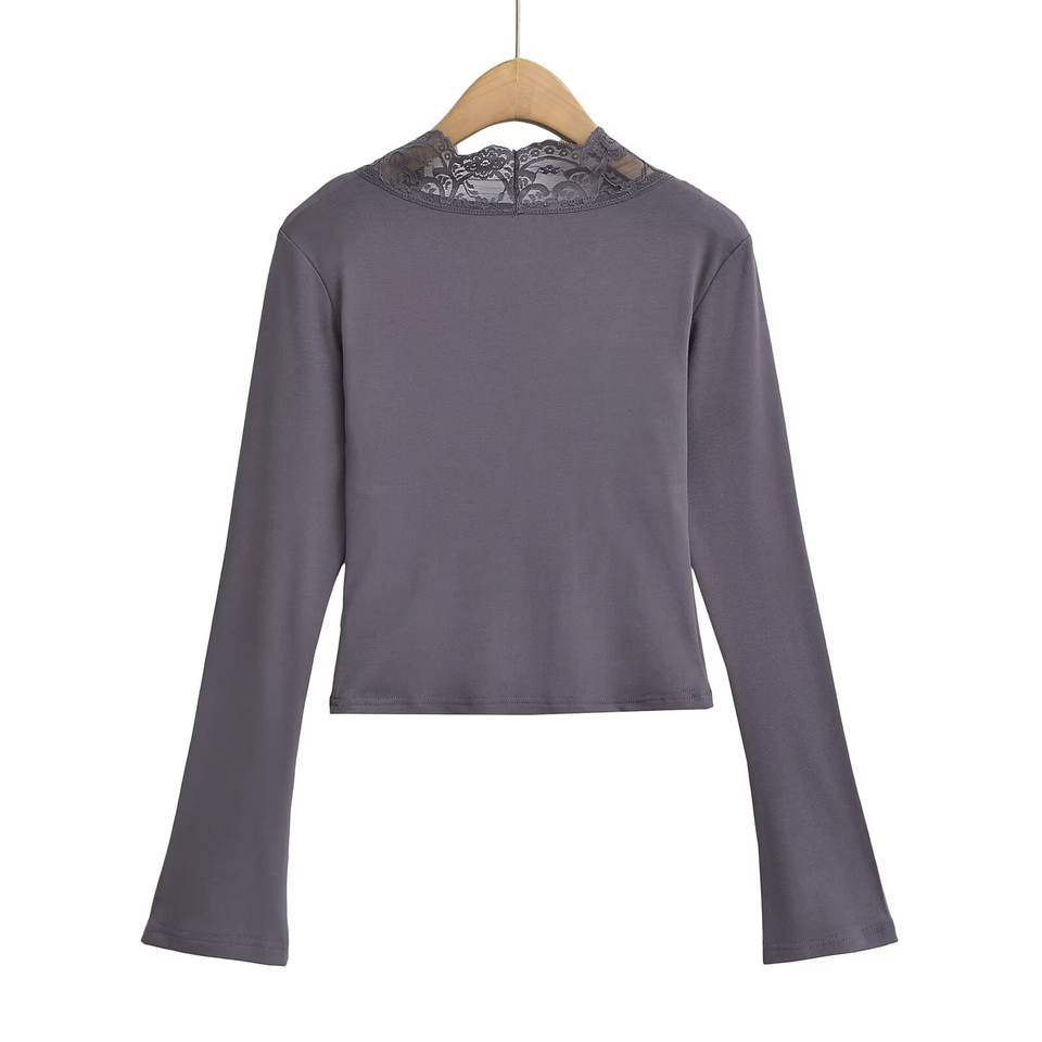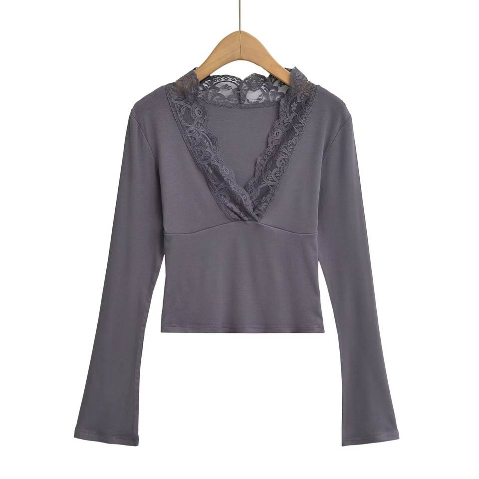 Women Spring New Fashion Breathable Short Polyester Woven Elegant V-Neck Stitch Lace Sleeve Slim Fit Casual Shirt