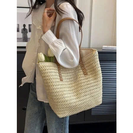 Women Straw Beach Shoulder Bag Large Capacity Woven Tote with Dual Leather Straps and Zipper Closure