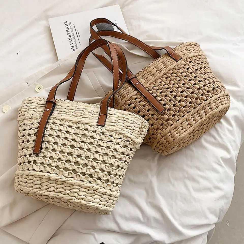 Women Straw Travel Beach Totes Woven Summer Handmade Good Quality Shoulder Hand Bag with Leather Handles From Vietnam