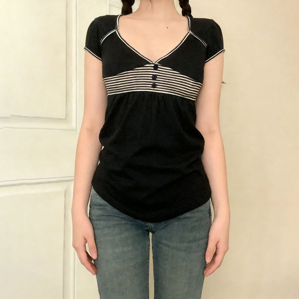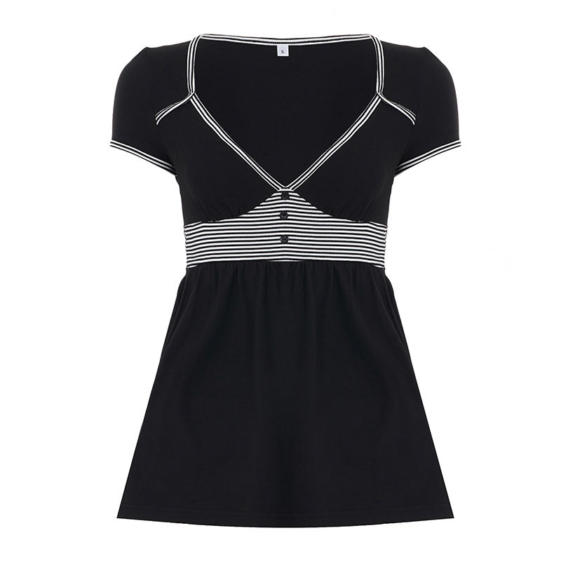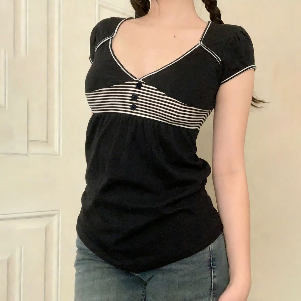 Women Striped Patchwork Button Front V Neck Short Sleeve T Shirt A Line Slim Fit Casual Y2K Streetwear Summer Knit Top