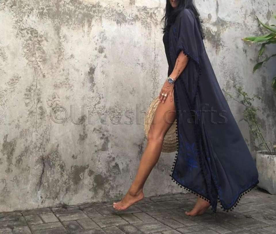 Women Stylish Hand Embroidered with Pom Pom Black Lace Open Front Long Kimono Beach Cover up