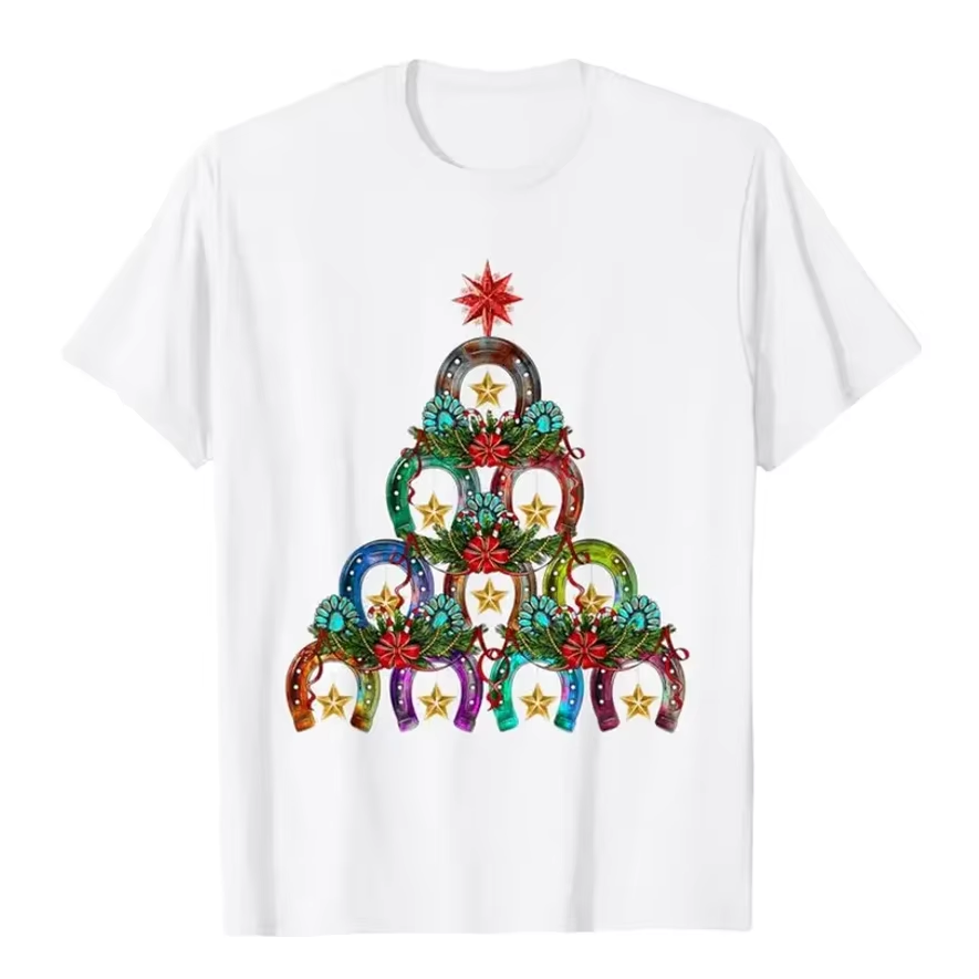 Women Summer Casual Horse Shoe Christmas Tree T-Shirt 100% Cotton Custom Silk Screen Print Lightweight Short Sleeve