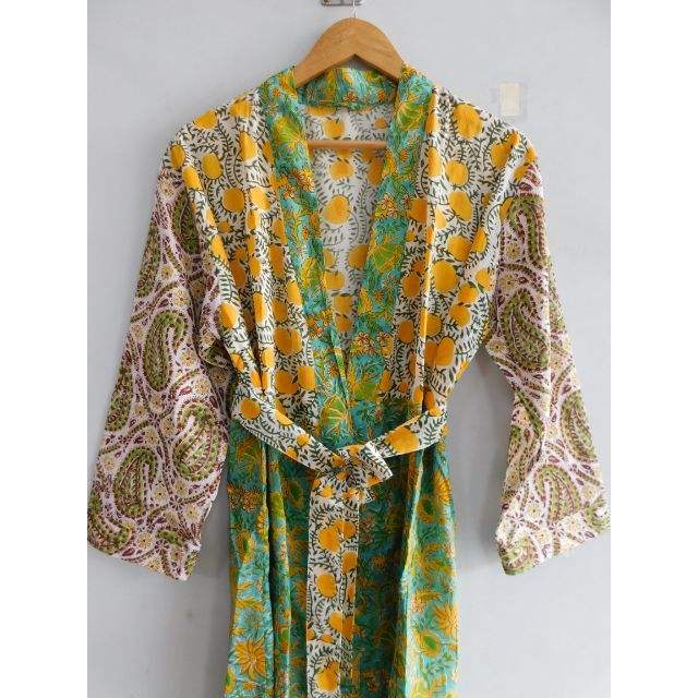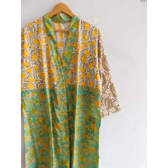 Women Summer Long Cotton Kimono Floral Block Printed Bridal Robe Gown