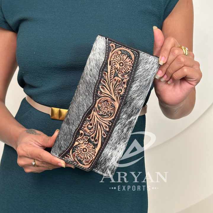 Product Name:Western Hair On Tooled Bi-fold Wallet