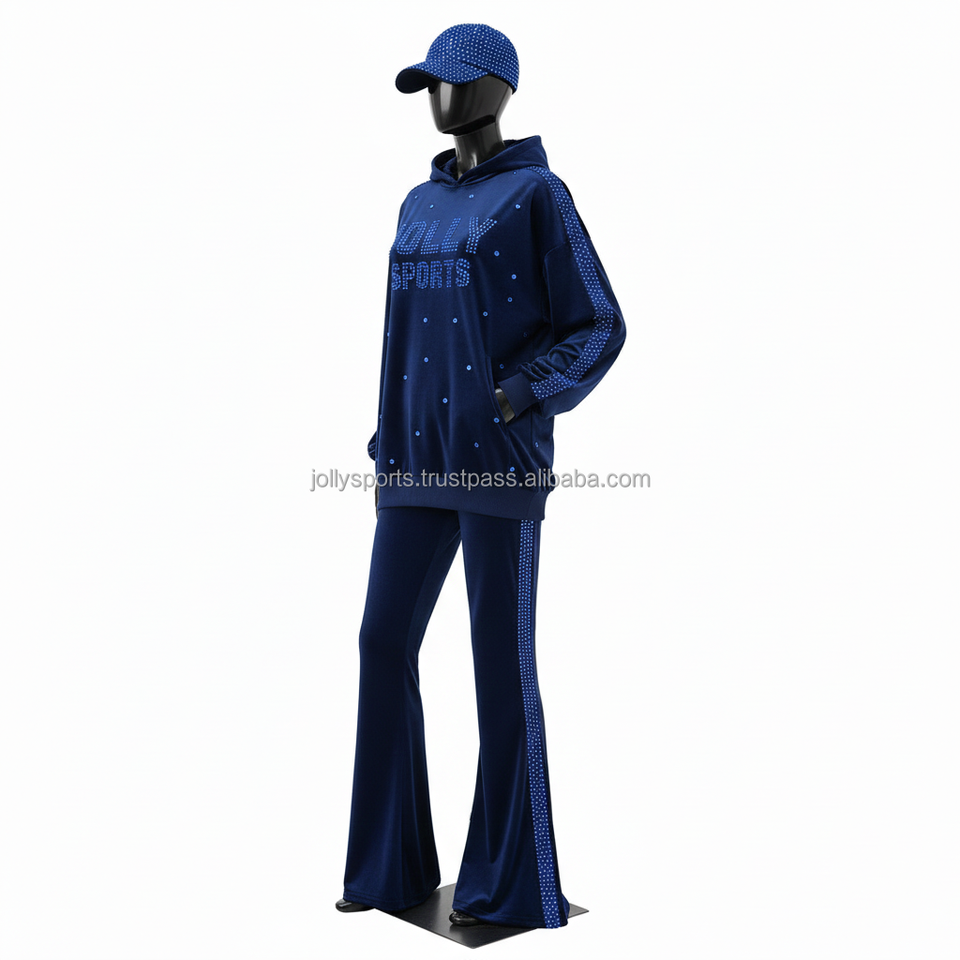 Women Tracksuit Premium Polyester Velour 280 GSM Navy Blue Panel Design Heat Press Rhinestone Custom Logo Tracksuits Plus size