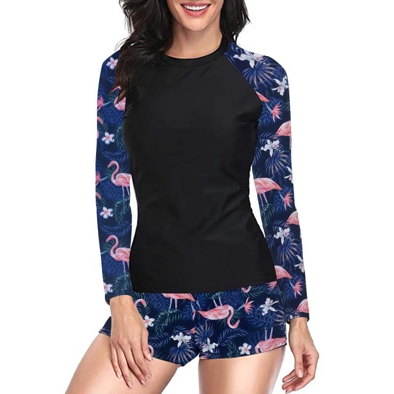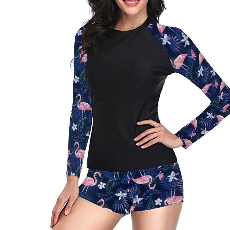 Women Two Pieces Vintage Print Rash Guard Swimwear Long Sleeve Shirt Shorts Surf Top Retro Print Running Shirt Split Swimsuit